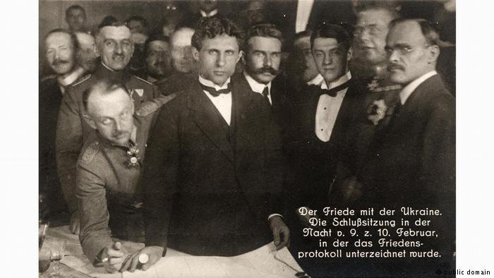11. У ніч з 9 на 10 лютого 1918 року у Брест-Литовську відбулось підписання мирного договору між УНР та Центральними державами. Після звернення УНР війська союзників розпочали просування в Україну. На фото: (зліва направо) генерал Брінкманн з генштабу армії Німеччини, українські делегати - Микола Любинський, Микола Левицький, Олександр Севрюк, німецький генерал Макс Гоффманн і Сергій Остапенко.