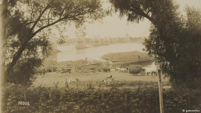 7. Німецькі війська переправляють сіно з лівого берега Дніпра на правий у Києві. Позаду Ланцюговий міст, який підірвали у 1920 році польські війська, що відступали з Києва.